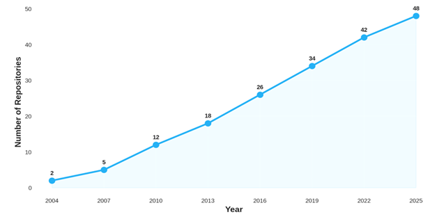 International adoption patterns reveal both successes and persistent challenges. While thousands of repositories now operate globally, research consistently documents obstacles including faculty reluctance to deposit materials Davis and Connolly (2007), copyright ambiguities, sustainability concerns, technical infrastructure requirements, and governance framework gaps. These challenges transcend institutional contexts, suggesting that technological solutions require complementary attention to organizational, cultural, and policy dimensions Sinha and Satpathy (2017).