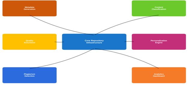 The proposed AI-assisted framework offers a comprehensive, theoretically-grounded approach integrating intelligent metadata management, automated content curation, personalized discovery systems, quality assurance mechanisms, and predictive analytics capabilities Greyling (2025). This framework balances technological innovation with practical implementation considerations, recognizing that sustainable repository development requires coordinated attention to technical, organizational, cultural, and policy dimensions Sinha and Satpathy (2017).